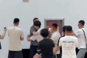 楊瀚森與青島隊工作人員握手致意,并與青島隊主帥劉維偉熱情相擁,兩人打趣交流。