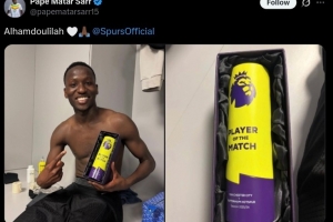 本場(chǎng)比賽熱刺球員薩爾表現(xiàn)不俗,賽后他也當(dāng)選英超官方評(píng)選出的本場(chǎng)最佳球員。球員賽后也在個(gè)人社媒曬出與獎(jiǎng)杯的合照。
