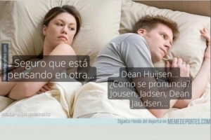 赫伊森貼出的圖片中有一對(duì)情侶,其中那個(gè)男的顯然是一個(gè)西班牙球迷,他糾結(jié)于赫伊森名字的發(fā)音(注:赫伊森是小時(shí)候從荷蘭移居到西班牙的,他這個(gè)姓氏在西班牙很罕見,而荷蘭語和西班牙語的發(fā)音有很大差別):“這個(gè)名字該怎么念呢?豪森,哈德森,丹-華森...", 他身旁的女友懷疑他有外遇了:“他肯定在想別的女孩..."