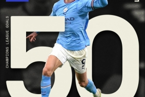 體育資訊9月19日訊 哈蘭德代表曼城在歐冠對陣那不勒斯的比賽中破門,打進個人歐冠50球。